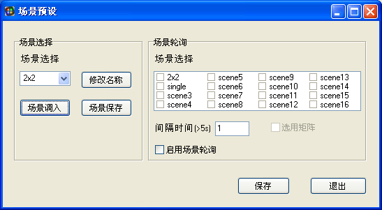 支持16種場景模式保存,可以更改模式名稱。選擇要保存的模式,設置完成后點擊“保存模式”。“調用模式”可以調用用戶保存過的模式、跟據有需求用戶的還可以啟用場景輪詢模式